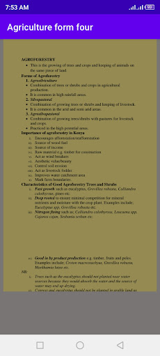 Permohonan ini melengkapkan pelajar dengan pertanian membentuk empat pengetahuan dengan bahan semakan K.C.S.E.-Agricultural Economics III -organisasi pemasaran budaya -farm akaun -Aragroforestry