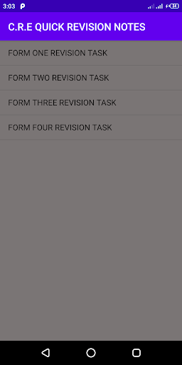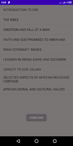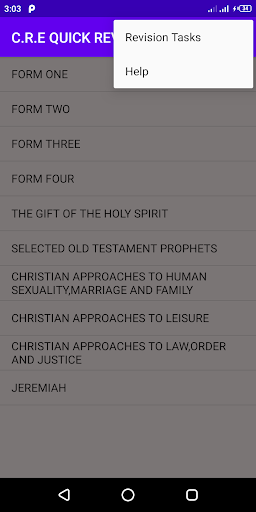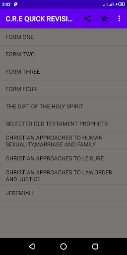 Aplikasi ini merangkumi topik-topik berikut dari tingkatan satu hingga tingkatan empat untuk subjek CRE
