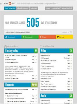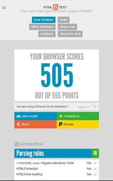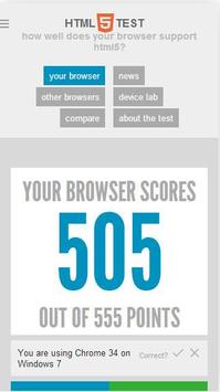 How well does your browser support HTML5? Over 10 test are made and you will get a total detailed overview with a score fra 0-555 point. Check it out with this app! THIS IS NOT AN OFFICIAL APP FOR HTML5TEST.COM!