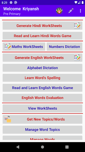 Aplikasi ini membolehkan ibu bapa dan guru menjana lembaran kerja untuk bahasa Hindi, Inggeris dan matematik untuk kelas yang berbeza.Oleh kerana manusia dapat mengingati apa -apa untuk jangka masa yang lebih lama jika ia adalah visual.Oleh itu, aplikasi ini membolehkan pelajar semua kumpulan umur mempelajari kata -kata dengan melihat gambar dan mereka juga boleh mempelajari permainan perkataan untuk kedua -dua bahasa Hindi dan Bahasa Inggeris.Aplikasi ini juga membolehkan untuk menghasilkan lembaran kerja tunggal dengan mencampurkan pelbagai jenis kata -kata, untuk menjadikan tuan pelajar, di dunia kata -kata.