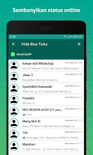 Ciri yang paling penting pada Sembunyikan Permohonan. Blue Ticks untuk WA boleh melihat atau membaca mesej yang telah dipadamkan oleh pengirim. Pengirim mesej tidak akan diketahui apabila anda kelihatan terakhir.