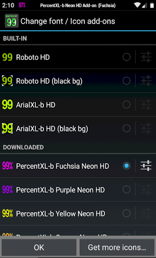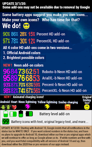 Nombor bar status berwarna dengan banyak tambahan percuma dalam warna terang termasuk Neon, dengan atau tanpa tanda peratus. Enam ikon pengecasan pilihan termasuk kilat animasi (kuning atau neon), jantung yang mengalahkan atau android menari. Pemberitahuan penggera bateri yang rendah dan penuh dengan ciri dan pilihan yang tidak terdapat dalam aplikasi lain.