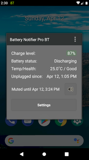 Nota: Notifier bateri Pro BT tidak 100% serasi dengan Android 10 dan ke atas. Jika peranti anda mempunyai Android 10 atau lebih tinggi, ia mungkin atau ia mungkin tidak berfungsi dengan peranti anda. Lihat siaran kami di Bateri Notifier News "Adakah Notifier Bateri Asal berfungsi pada Android 10 dan ke atas?" Di http://batterynotifierpro.blogspot.com/