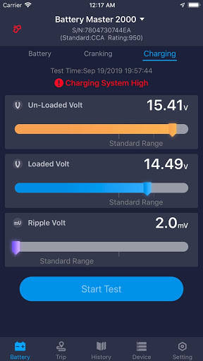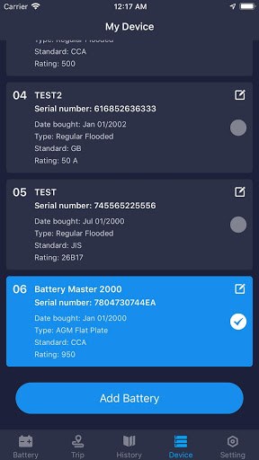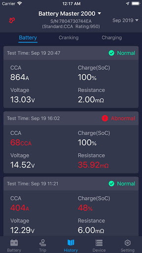 Dengan dipasang pada bateri, ia dapat menguji CCA dan keadaan kesihatan bateri, mengira jangka hayat penggunaan bateri berdasarkan suhu dan lembaran data CCA.Ketika telepon dekat dengan perangkat, aplikasi akan memperoleh hasil uji baterai secara otomatis.Pengguna juga boleh menguji kesihatan bateri, sistem engkol dan sistem pengecasan.Semua hasil ujian sejarah yang disimpan dapat dikongsi dan dicetak.