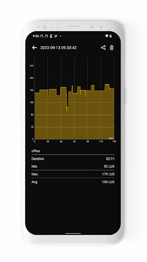 You can measure light intensity over long periods of time. The application automatically saves and statistics the measurement, allowing you to view and analyze the data later.