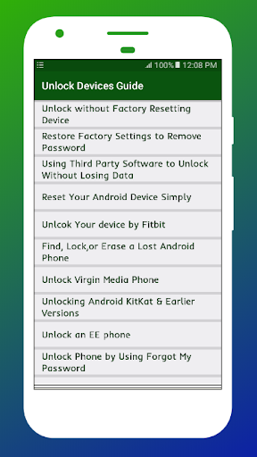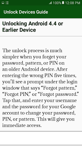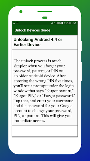 Unlock any device guide free to protect and secure data. Everyone needs to secure data or preventing unauthorized use of his data in this modern era. One method to protect your phone data is to lock your phone screen by pattern, pin or in other way like face recognition. This app provide guide to solution of problems of device locking or unlocking. Easy Unlocking Guides Process Explained.
