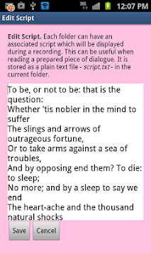 I also added the ability to create a script for each folder that is displayed during recording; like a crude teleprompter. This script is stored as a plain text file in the folder (with filename script.txt) and is editable from the App or can be created/edited with you favorite text editor and placed in the folder.