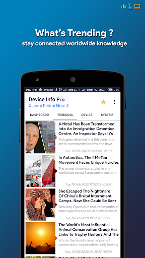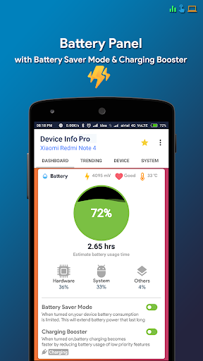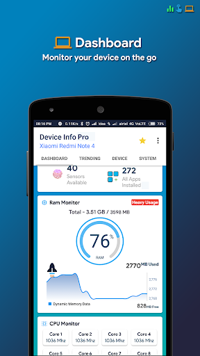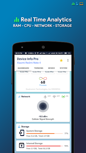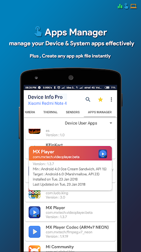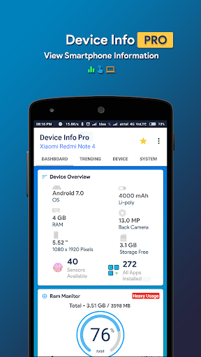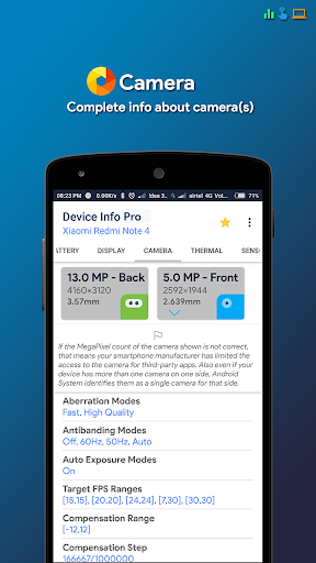 Maklumat peranti adalah aplikasi Android yang kuat dan sangat bermaklumat yang menyediakan maklumat lengkap mengenai mana-mana peranti telefon pintar dari atas ke bawah dengan antara muka pengguna pintar. Maklumat peranti termasuk maklumat mengenai CPU, RAM, OS, sensor, penyimpanan, bateri, SIM, Bluetooth, apl yang dipasang, aplikasi sistem, paparan, kamera, dan lain-lain.