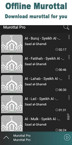 Aplikasi Murottal Pro adalah aplikasi yang menyediakan Murottal MP3 lengkap yang memudahkan pengguna untuk mendengarkannya melalui smartphone. Dalam aplikasi ini terdapat ribuan murottal dan qori yang dapat dimainkan dengan mudah yang dirancang dengan penampilan yang responsif dan menarik untuk pengguna.
