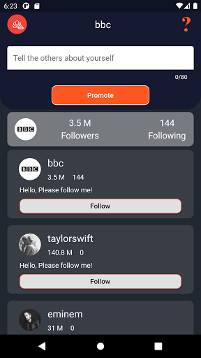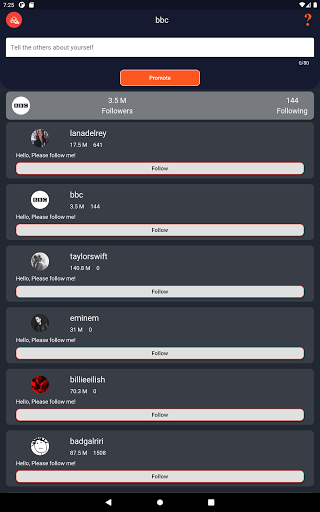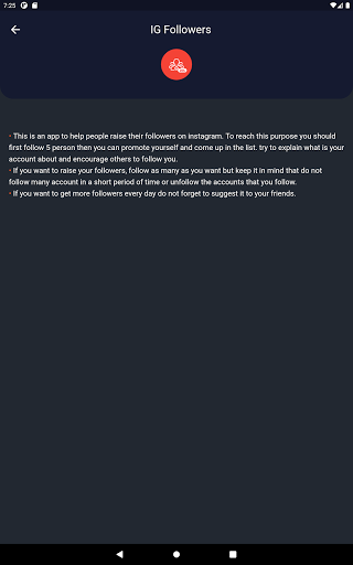 IG Followers is an app that help you get real followers and discover new accounts on Instagram. you can increase your followers number as simple as possible and boost your account, you just need to enter your Instagram username and start getting followers. for getting followers first you should follow 5 person then you can promote yourself and come up in the list.