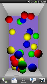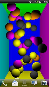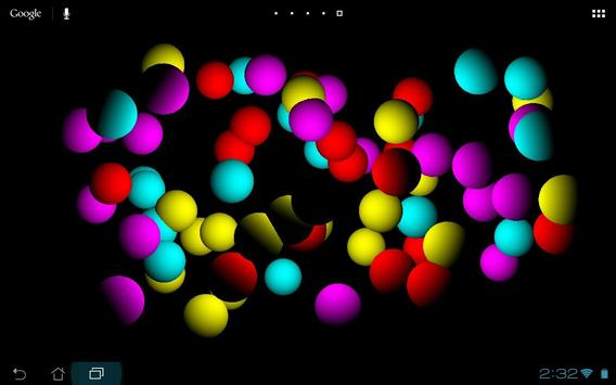 This live wallpaper displays coloured balls bouncing around the screen within a 3D space. This means that the balls bounce in and out of the screen as well as against the sides. Combined with dynamic lighting and varying ball speeds, the result can be mesmerising to watch.