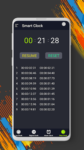 Simpan rekod masa dengan jam randik. Tekan permulaan dan hentikan untuk menjalankan dan menghentikan jam randik. Masa berlalu boleh dilihat pada paparan digital teratas. Untuk merakam pusingan, tekan butang pusingan, tangan pusingan akan ditambah ke paparan analog, dan untuk menetapkan semula tekan butang set semula. Anda boleh mengakses senarai pusingan dengan menu lungsur di bahagian atas atau hanya meluncur jari anda ke kiri. Dalam senarai pusingan pengguna boleh melihat pusingan mula dan masa akhir.