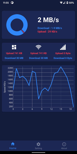 Ujian kelajuan untuk memeriksa status Internet anda dan mendapatkan kelajuan muat turun / muat naik menggunakan penggalak kelajuan Internet. Ujian kelajuan 4G untuk ujian kelajuan wifi.