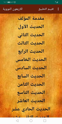 هو تطبيق يحتوي علي كتاب الاربعون النووية للامام النووي رحمه الله وهو كتاب يحتوي علي اثنين واربعين حديثا انتقاها الامام النووي من صحيحي البخاري ومسلم وهي احاديث في اعلي درجات الصحة ويمكن من خلال هذا التطبيق التحكم في حجم الخط حسب رغبة المستخدمبكل سهولة ويسر