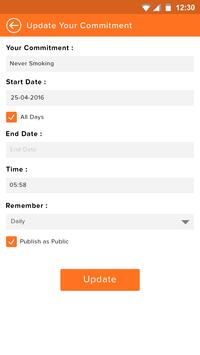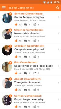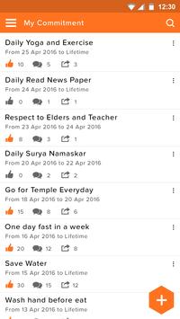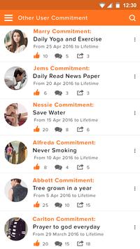 You can take your commitment with your own text or common commitment text. Your task is not finish yet, you need to do daily reporting for your commitment statement so it will remember you and gain your self confidence and also it will help you to achieve your goal. User can see the commitment report card on the base of him/her commitment reporting and likes. The system also remind you for your commitment depend on your choice.