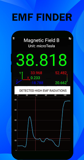 Emf detector use this simple application to detect emf, metals and devices. All emf detection method is to shown in Micro Tesla (µT). Ultimate emf meter display the result with Real emf graph. emf scanner is the great Emf analyzer and Emf ghost detector app for android devices.