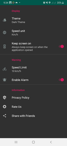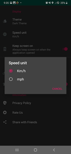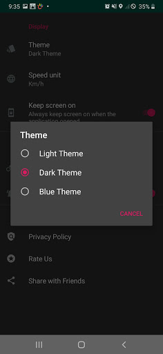 3. Kelajuan rekod dalam lima skala yang "KM / H (kilometer setiap jam), MPH (batu sejam), Ahli Parlimen (meter sesaat), FT / SEC (kaki sesaat) dan knot (batu nautika sejam)". br> 4.Support tema gelap. Aplikasi Speedometer mempunyai tiga tema. Itulah: "tema ringan", "tema gelap" dan "tema biru".