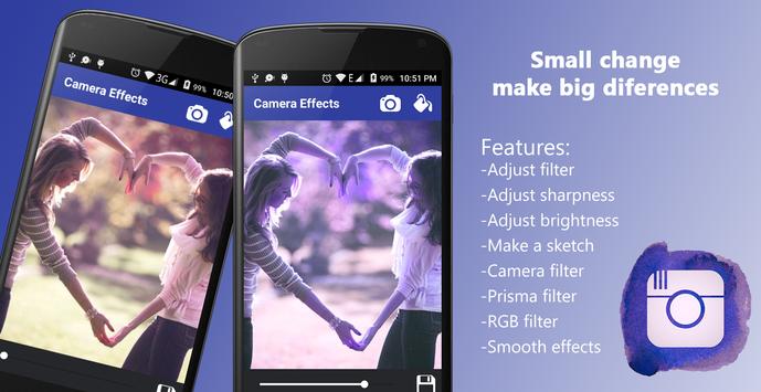 Camera Effects is an easy and fun way to enhance your personal photos. It makes your photos beautiful with easy and powerful editing tools. Lots of unique effects, easy to use, share via Facebook, Twitter and many more. It takes no time at all to make good photos look great.