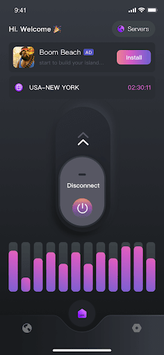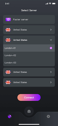 Menyediakan mudah dengan sambungan satu klik. Pelayan bertukar semudah memilih lokasi baru (tidak perlu menutup sambungan yang sedia ada terlebih dahulu). Aplikasi ini juga boleh memilih pelayan yang terbaik untuk anda secara automatik.