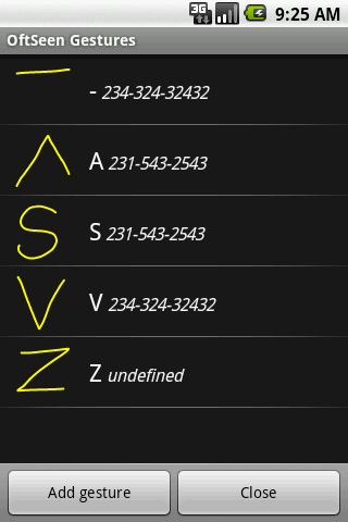 OftSeen Gestures lets you speed-dial by drawing a gesture. Create your own gestures and assign numbers to them. Place an icon on your desktop for fast calling of phone numbers. Release 2.2.0: Updated to support Android KitKat.