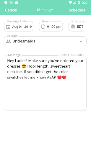> Dan kerana Wedtexts membolehkan anda menghantar mesej teks perkahwinan masa nyata yang tidak terhad, anda tidak akan ditekankan apabila sesuatu yang tidak dapat dielakkan berlaku pada saat-saat akhir.