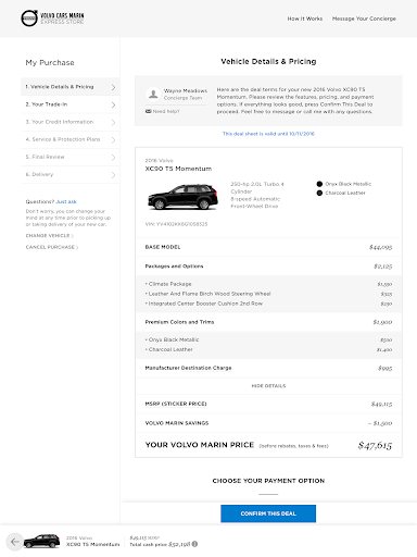 The app provides a full screen browsing experience that is great for walking your customers through every aspect of the car buying transaction including inventory, pricing, financing and leasing terms, trade-in, credit application, and service and protection plans. After configuring any vehicle, new or used, you can easily email or text details to your customer - or provide them with a printed summary of the deal. The whole car buying transaction can be completed 100% online.