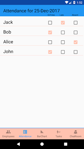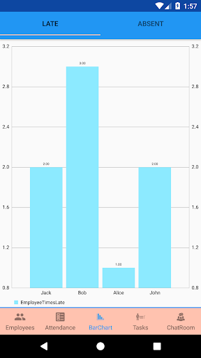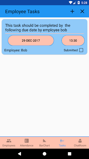 This app is designed to help the manager communicate with his employees and stay up to date with any changes that can happen.Also the app help the manager assign tasks to his employees and be reminded when deadline for the task happen. The manager can mark the daily attendance of his employees and the manager can enforce penalties for arriving late or being absent from the settings.The app also allows the manager to see the statistics of attendance of his employees to give a better view of punctuality of his employees.