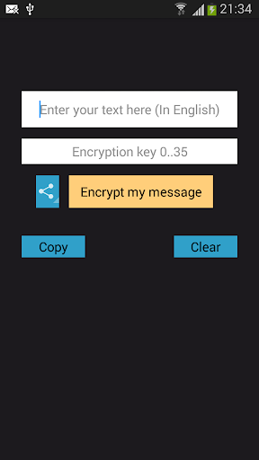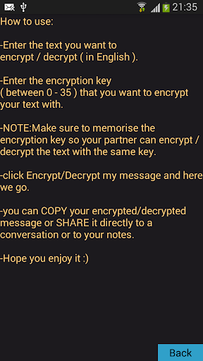 -You can encrypt and decrypt any text ( in English ). -Go to "How to use" page , to read the instructions about using this app. -Please report any problems in comments.
