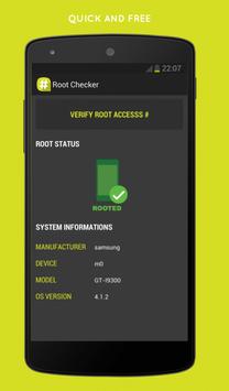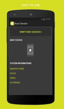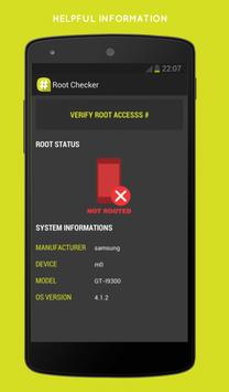 note : This application does not modify any system files. The only purpose of this root checker is to check if you have root access or superuser. It also provides to you helpful information about your device .