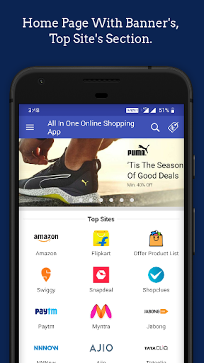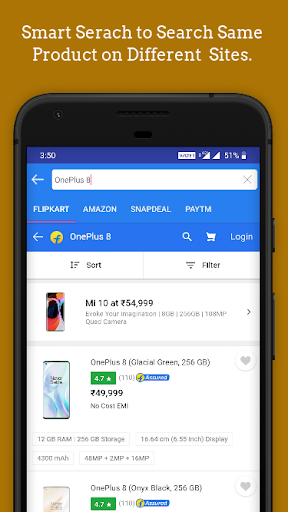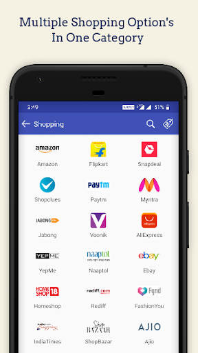 Aplikasi ini termasuk semua laman web membeli-belah yang popular di India termasuk Amazon, Snapdeal, Myntra, Shopclues, AJIO, OLX, Tata Cliq, Shein, Club Factory.