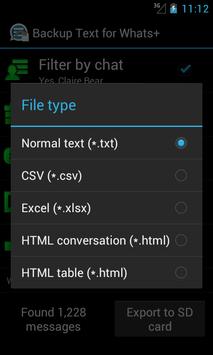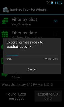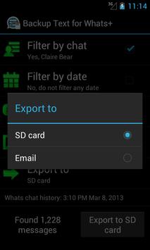 Backup Text for Whats+ allows you to export your Whats Plus messages, convert to Plain Text, CSV, Excel and HTML file formats and yes, those files can be read in your phone or computer! Your exported files can be saved on your phone's SD card or sent to your email as attachment. It is fast and easy to backup your Whats Plus messages!