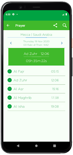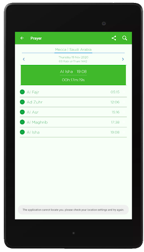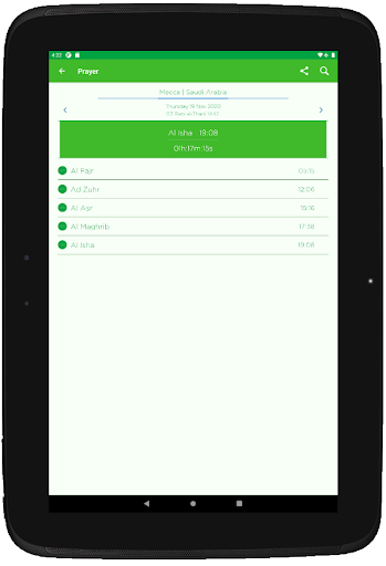 • Peringatan sebelum waktu panggilan untuk berdoa, dengan kemampuan untuk memilih waktu peringatan untuk setiap doa secara terpisah
