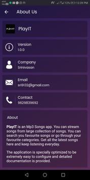 PlayIT is an Mp3 Songs app. You can stream songs from large collection of songs. You can search you favourite songs or go through your favourite categories. Get all the latest songs here and keep listening everyday.