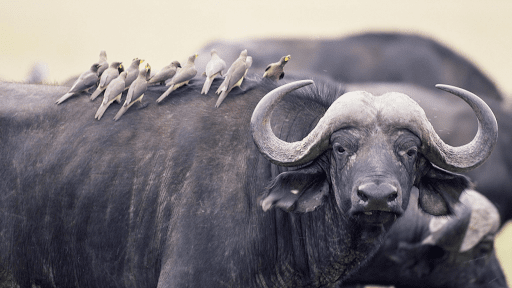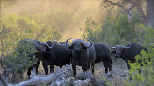 Buffalo are large members of the Bovidae family. There are two types of buffalo: the African or Cape buffalo and the Asian water buffalo. They are dark gray or black animals that look a lot like bulls. Buffalo are social animals and live in groups called herds.