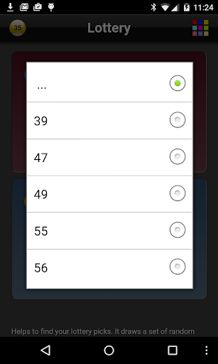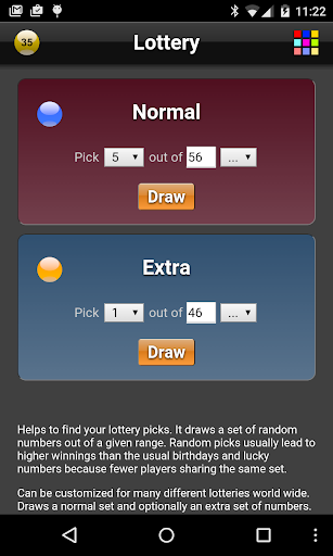Membantu mencari pilihan loteri anda.Ia menarik satu set nombor rawak daripada julat yang diberikan.Pilihan rawak biasanya membawa kepada kemenangan yang lebih tinggi daripada hari lahir biasa dan nombor bertuah kerana pemain yang lebih sedikit berkongsi set yang sama.