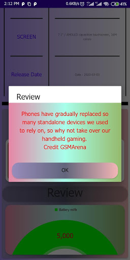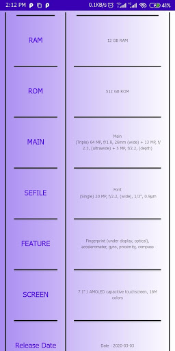 You can search phone specifications like ram,capacity etc. And you can watch launch video. Logo and Icons by Icons8. Data by GSMArena. Benchmark data by AnTuTu.