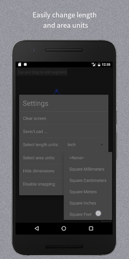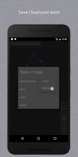 * Settings button allows for saving new sessions, loading existing sessions, changing units of measurement, snapping, and dimension visibility