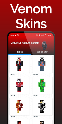 Anda akan mendapati kulit HD yang indah dari Spiderman, Venom, Peter Parker Blacksuite, dan lain-lain.Kulit Venom untuk Minecraft PE sangat mudah digunakan.Cuma klik butang untuk mula bermain dengan kulit kegemaran anda atau dengan memuat turunnya terlebih dahulu.