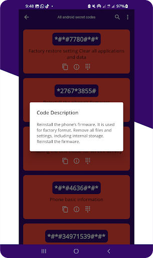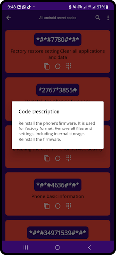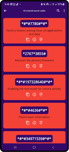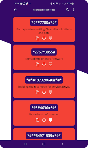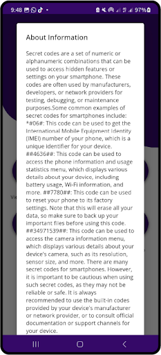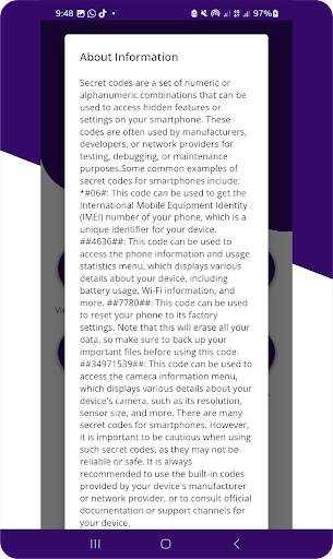Mengenai aplikasi ini, anda akan mendapat semua kod rahsia dan tersembunyi yang diperlukan untuk mengetahui maklumat tersembunyi mengenai pembuatan telefon bimbit anda, kerana peranti itu berjalan di Android, Harmoneyos dan iOS.Aplikasi ini juga memberikan siaran mudah alih terkini pada masa ini.Trik dan hacks untuk membaiki telefon anda jika ia tidak berfungsi, semuanya disediakan pada kemudahan anda.