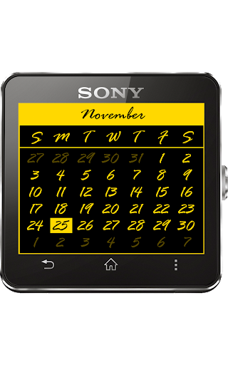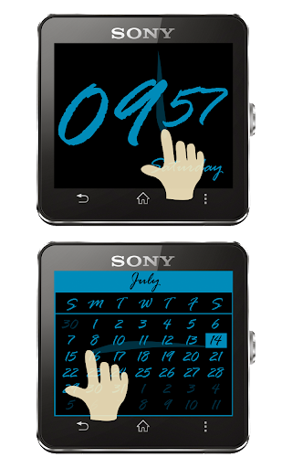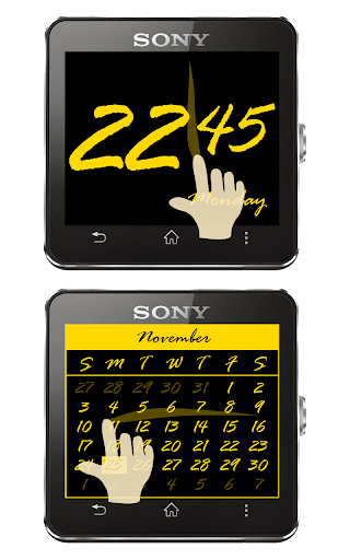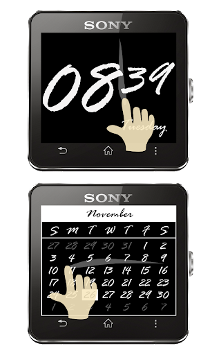 Ini adalah jam yang indah dan mewah untuk SmartWatch 2 anda, yang juga merupakan kalendar. Nikmati penyelesaian pintar 2-dalam-1 ini dengan cara yang elegan. Leret jari anda secara menegak pada skrin untuk beralih dari jam ke kalendar, sapu secara mendatar untuk menavigasi bulan-bulan kalendar, sapu secara menegak sekali lagi dan anda akan kembali ke jam.