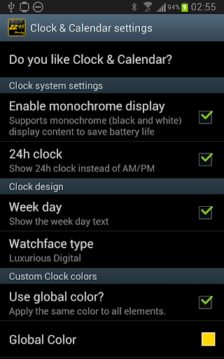 Jam & Kalendar Menyokong Ciri Paparan Monochrome SmartWatch 2 yang juga dikenali dengan mod kuasa yang rendah.