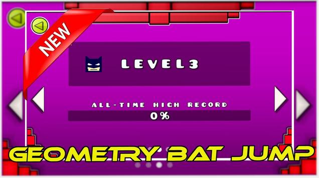 geometry bat jump Plan for a near shocking test in the domain of Geometry Dash . Stretch your capacities beyond what many would consider possible as you jump, fly and flip your way through perilous sections and spiky blocks.