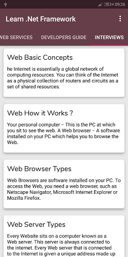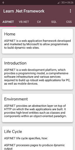 This Application provides an introduction to Learn .Net Framework and ASP.Net Development or Programming with ASPNET, VBNet, C#, CSS, CSS3, HTML, HTML5, JavaScript, VB-script, jQuery, jQueryUi, Ajax, WCF, WPF, Web Services, SQL Server and all topics cover Interview Questions and .net programming and allows someone with a basic knowledge of programming to start creating Applications. It is a light course to cover fundamentals of .Net Framework and ASP.Net Development or Programming.
