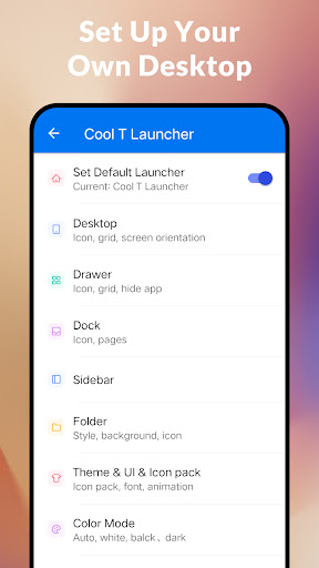 Cool T Launcher adalah pelancar gaya Android 13, dengan ciri -ciri Android 13, seperti ikon 'Warna menyesuaikan diri dengan kertas dinding, mengubah bentuk ikon;Pelancar Cool T juga mempunyai banyak tema, wallpaper hidup, banyak pilihan untuk membuat telefon anda sejuk dan mudah digunakan.Orang yang mempunyai telefon lama yang lama dan ingin merasakan Android 13 terbaru, ingin membuat telefon mereka kelihatan baru dan moden, hanya gunakan pelancar T Android ™ 13 yang sejuk ini
