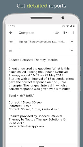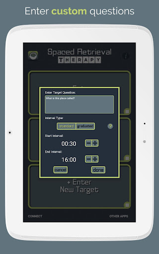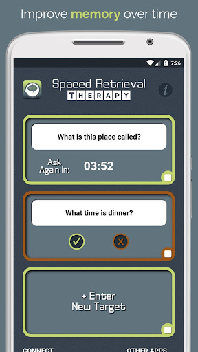 Aplikasi terapi pengambilan semula ini menggunakan kaedah latihan yang terbukti secara saintifik untuk membantu orang yang mengalami demensia atau gangguan ingatan yang lain untuk menarik balik maklumat penting. Mengimbas kembali jawapan untuk mengalikan selang waktu, seperti 1 minit, 2 minit, 8 minit, dan sebagainya, membantu untuk menyusun maklumat dalam ingatan.