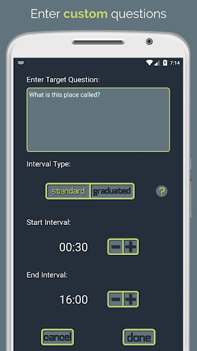 Sila ambil perhatian: Aplikasi ini adalah pemasa dan data trek. Sasaran harus dipilih secara individu untuk orang yang cacat memori untuk menjadi relevan dan bermakna. Aplikasi ini tidak bertujuan untuk digunakan secara bersendirian oleh orang yang cacat memori, tetapi sebagai alat terapi oleh seorang doktor atau ahli keluarga yang dilatih dalam teknik ini.