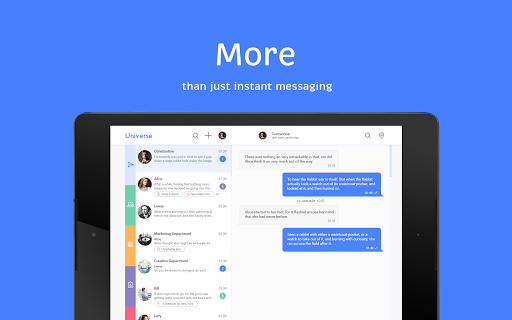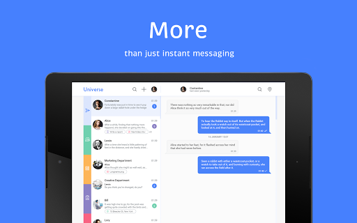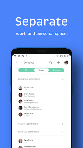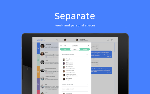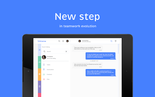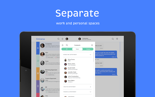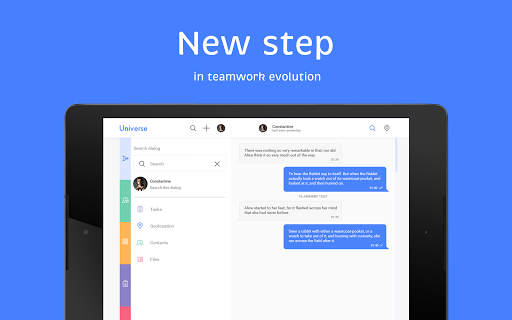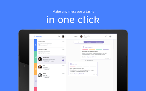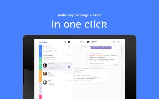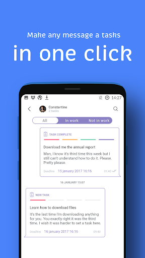 Use familiar and popular instant messaging app methods to manage your business. Set and accept tasks in one click. Separate work and personal accounts. Keep corporate notifications away from main communication but at hand whenever you need them. Discuss, control, negotiate, achieve results. Join the new world of instant workflow.