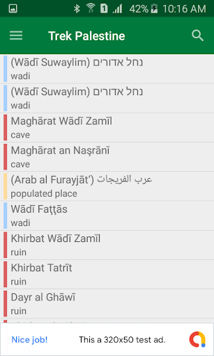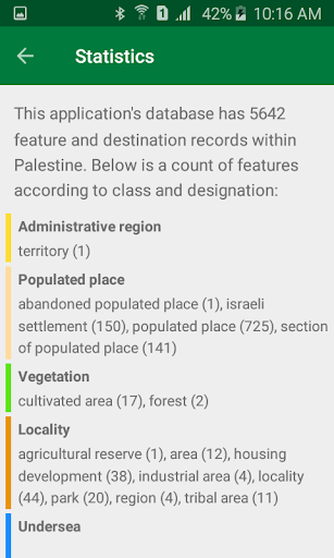 Trek Palestine application is a hiker's guide to geographic points of interest within Palestine. You will be able to search for, locate, and maybe even visit, 5642 interesting spots and features within the country.