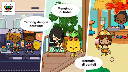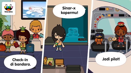 Dengan empat lokasi yang anda boleh melayari dalam kehidupan Toca: bercuti, anda tidak akan kehabisan idea untuk cerita anda. Mahu memulakan pengembaraan di lapangan terbang? Bersenang-senang dengan mesin x-ray, naik di atas kapal terbang, dan lawati kokpit. Anda juga boleh merasakan makanan ringan dan menikmati penerbangan anda! Di destinasi anda, anda mempunyai banyak pilihan aktiviti: membeli-belah, mencuci mata di kaki lima, bermain di pantai, melayari laut, dan meneroka hotel.