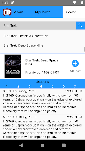 TV Tracker Two is a handy app to keep track of all the TV shows you want to watch. It can also be used as a very quick look up of a show's information, like when it premiered, and when each episode aired.